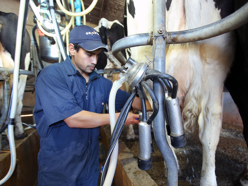 El primer trabajo del día es el ordeñe de los animales para extraer la materia prima.